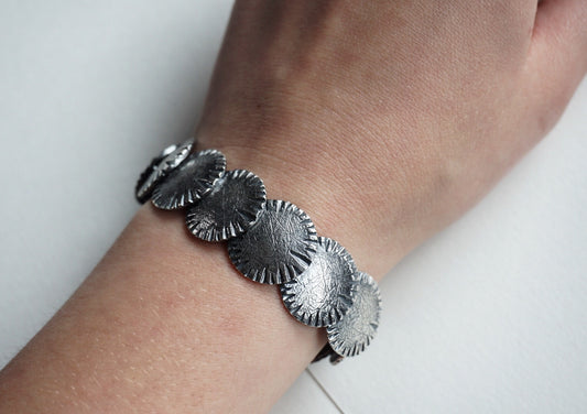 Carved and textured sterling disc bracelet