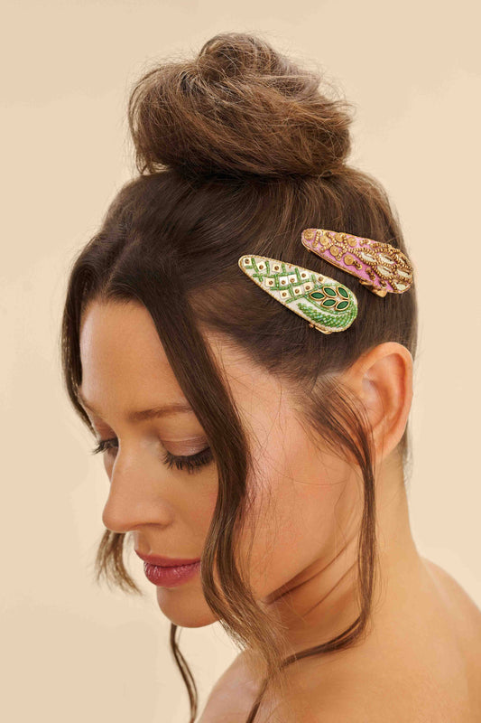 Jewelled Hair Clips (Set of 2) - Tile and Wheat, Sage & Teal