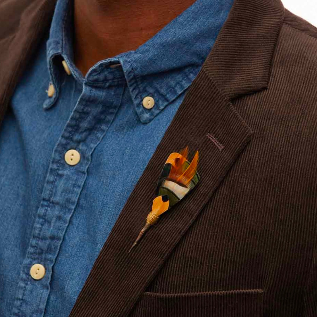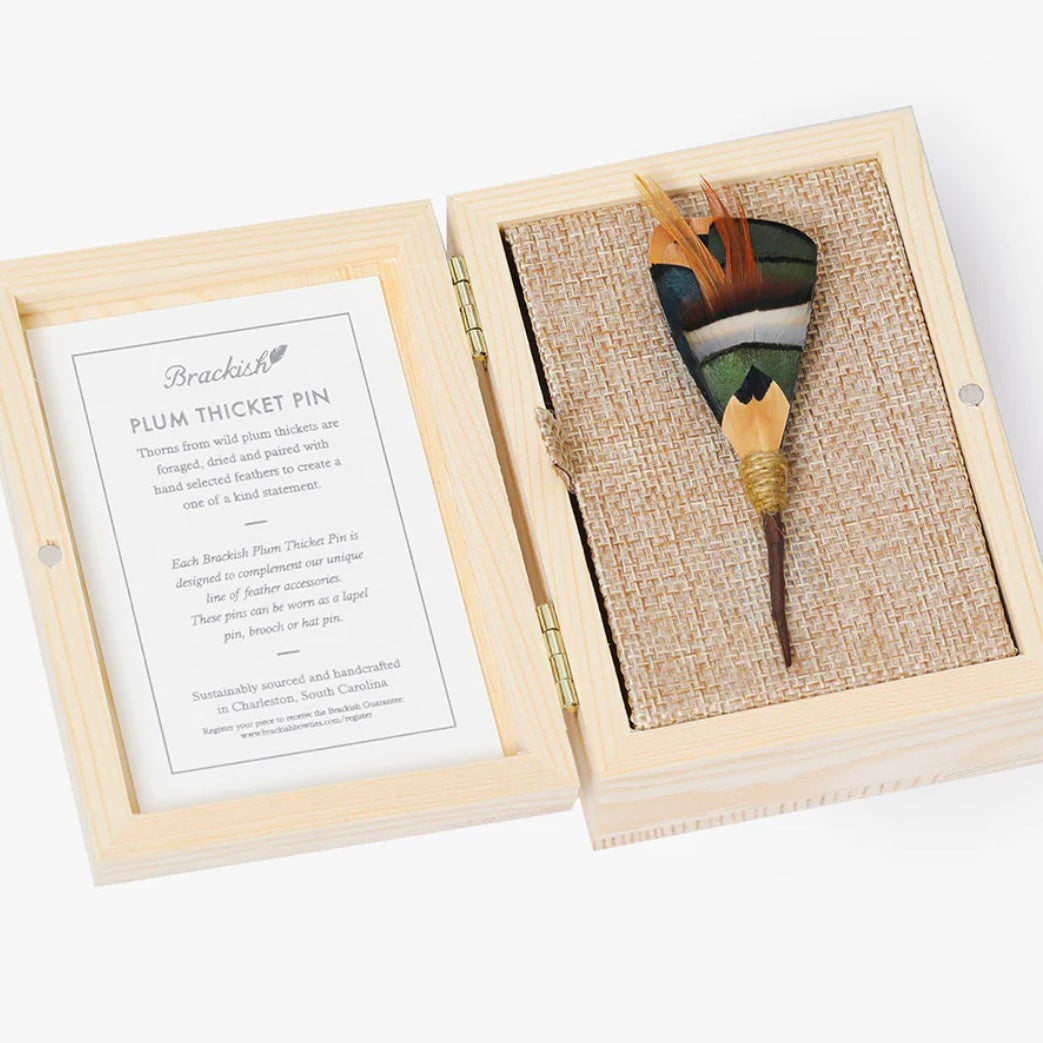 Thorns from wild plum thickets are foraged, dried and paired with hand selected feathers to create a one of a kind statement.
