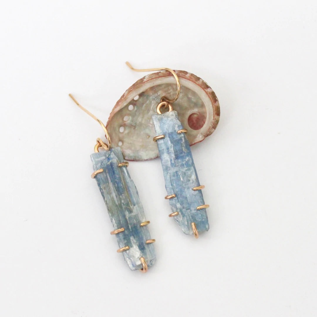 Raw Kyanite sticks are captured by hand crafted prongs in these beautiful dangling earrings. Available in 14K Gold Filled or Sterling Silver.