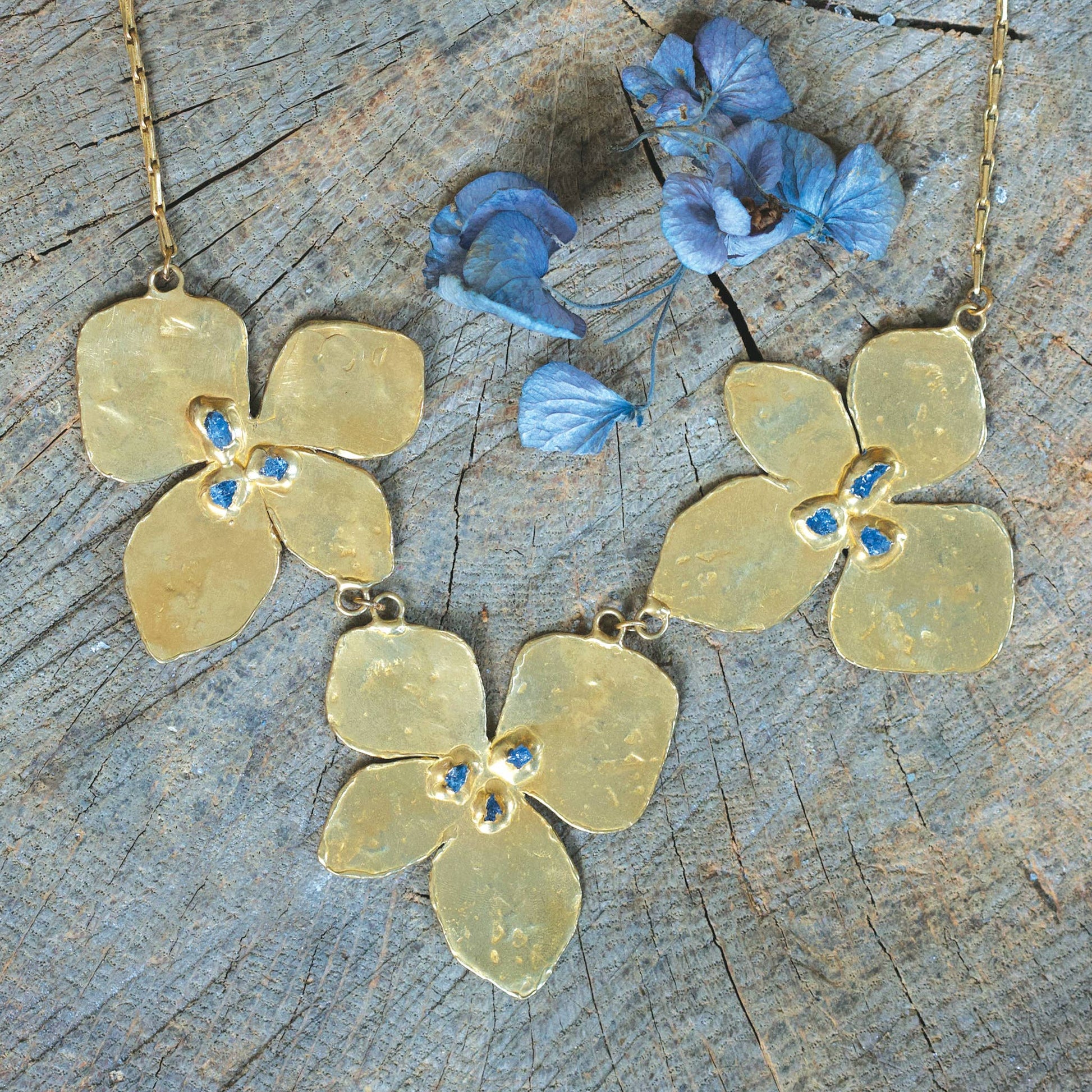 The Arcadia collection was inspired by the succession of spring. As the frost melts away revealing the first buds, it's time to reawaken and rejoice. A time to step into the sunshine and let the sun kiss your face. Blue sapphire are embedded in brass and dangle from our signature brass chain with a handmade clasp.