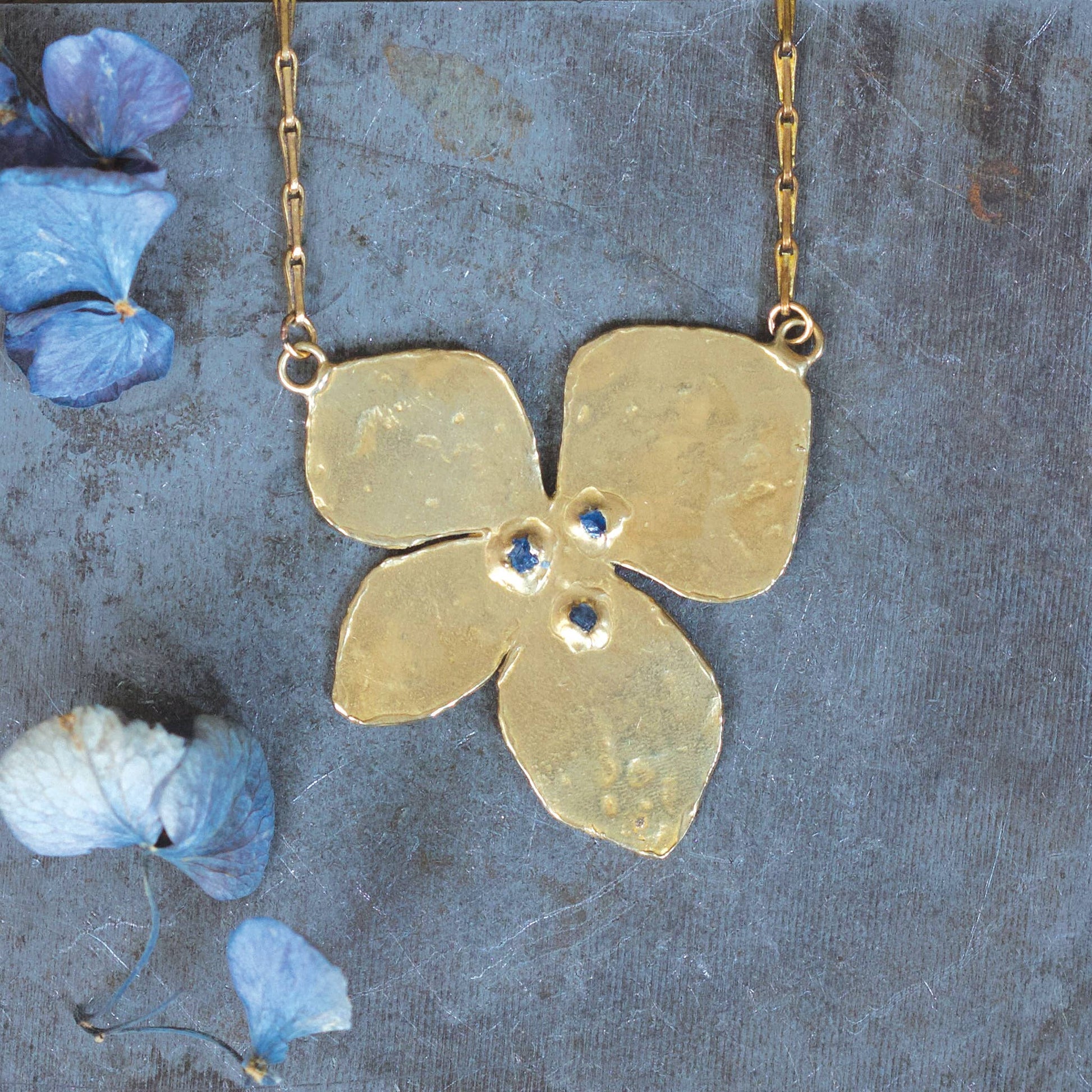 Three blue Sapphires are embedded in a brass hydrangea flower. Hanging on Emilie's signature brass chain with a handmade clasp. 1 3/4” Pendant Height 18-20” Chain Length. Each piece will vary slightly due to the uniqueness of the stones. All metal is nickel free.