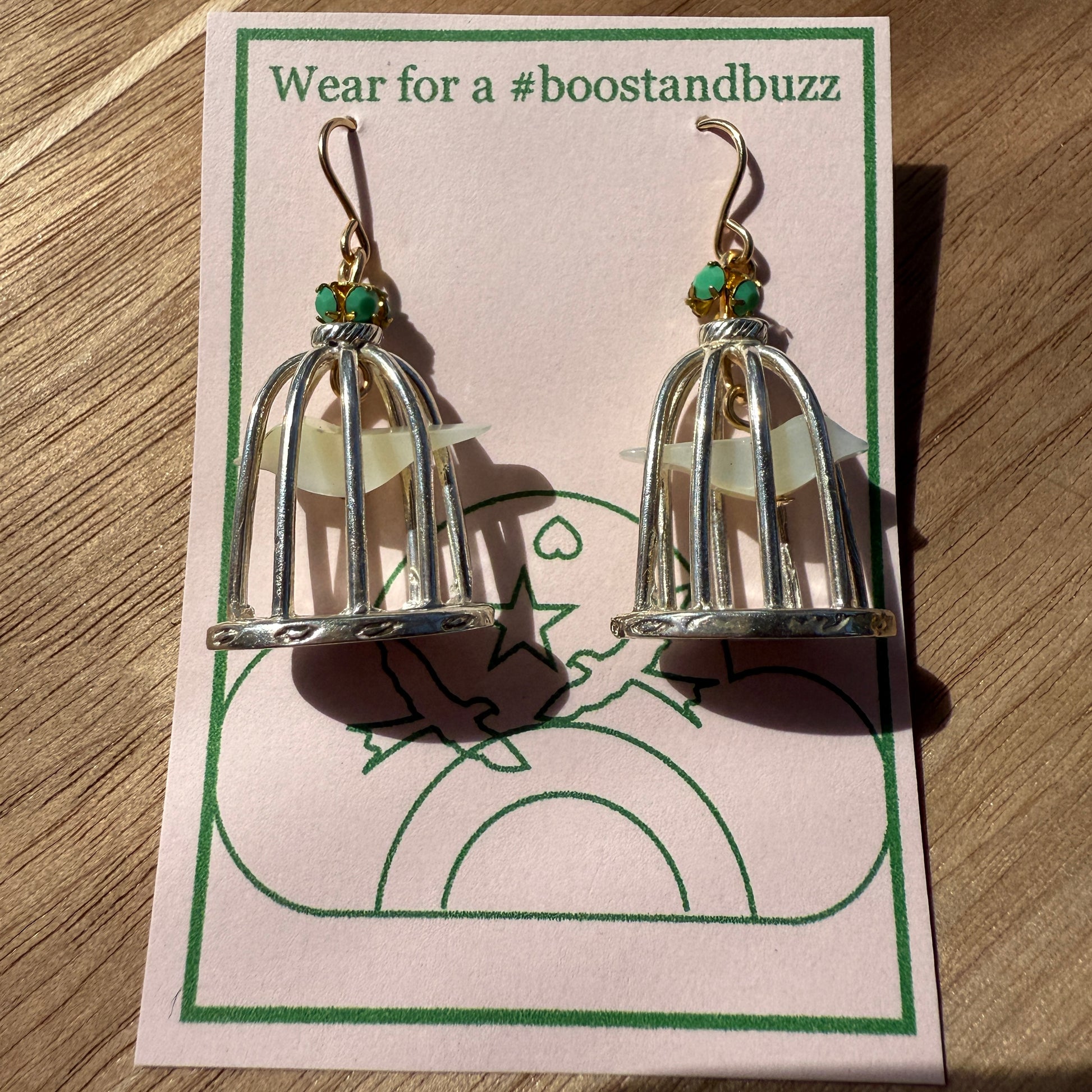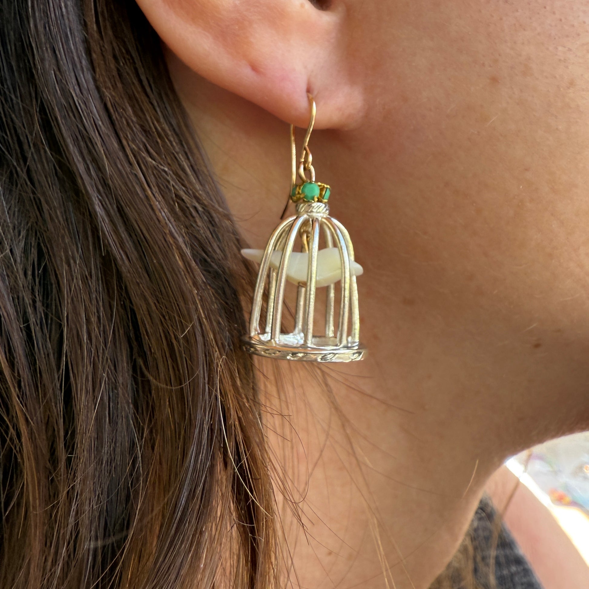Bird cage earrings, sterling silver bird cage, gold filled ear wires w/ rubber stoppers, shell bird. Tiny crystal detail on top of bird cage.