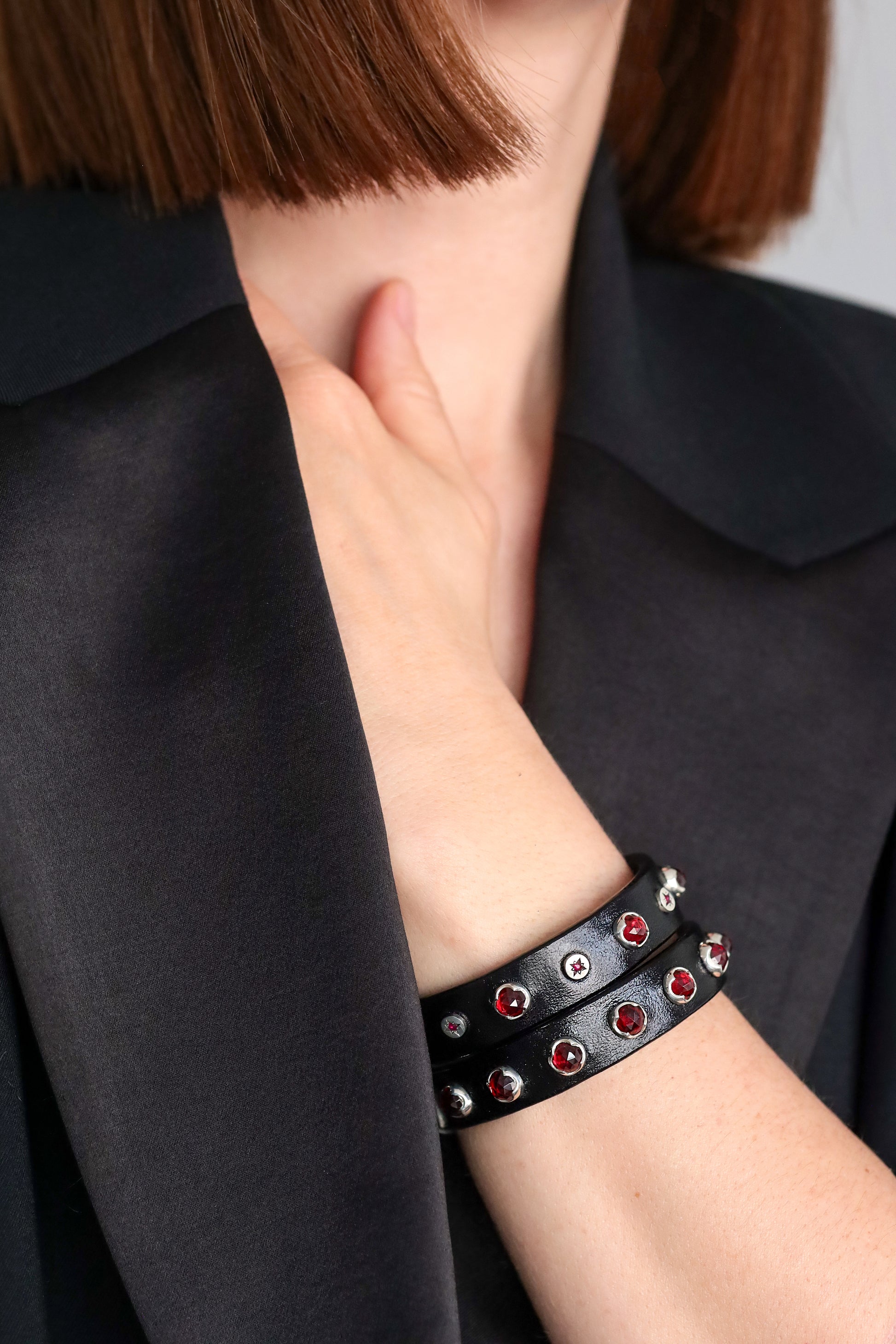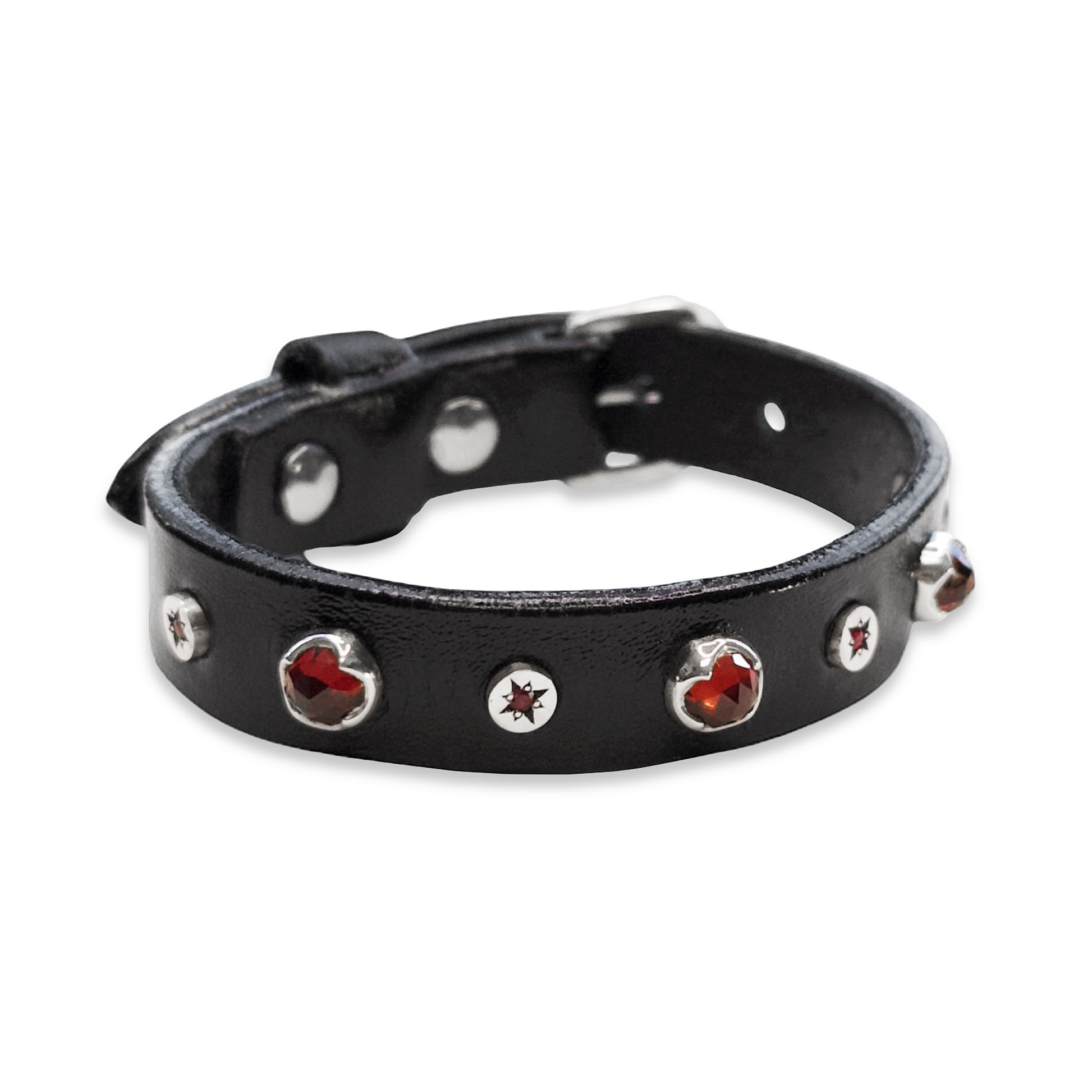 9 3⁄4 x 1⁄2 in. buckle bracelet featuring black leather and 3 scalloped bezel set rosecut garnets alternating with 4 star set ruby rivets. Buckle, bezels, and star rivets are sterling silver while the plain rivets are stainless steel.