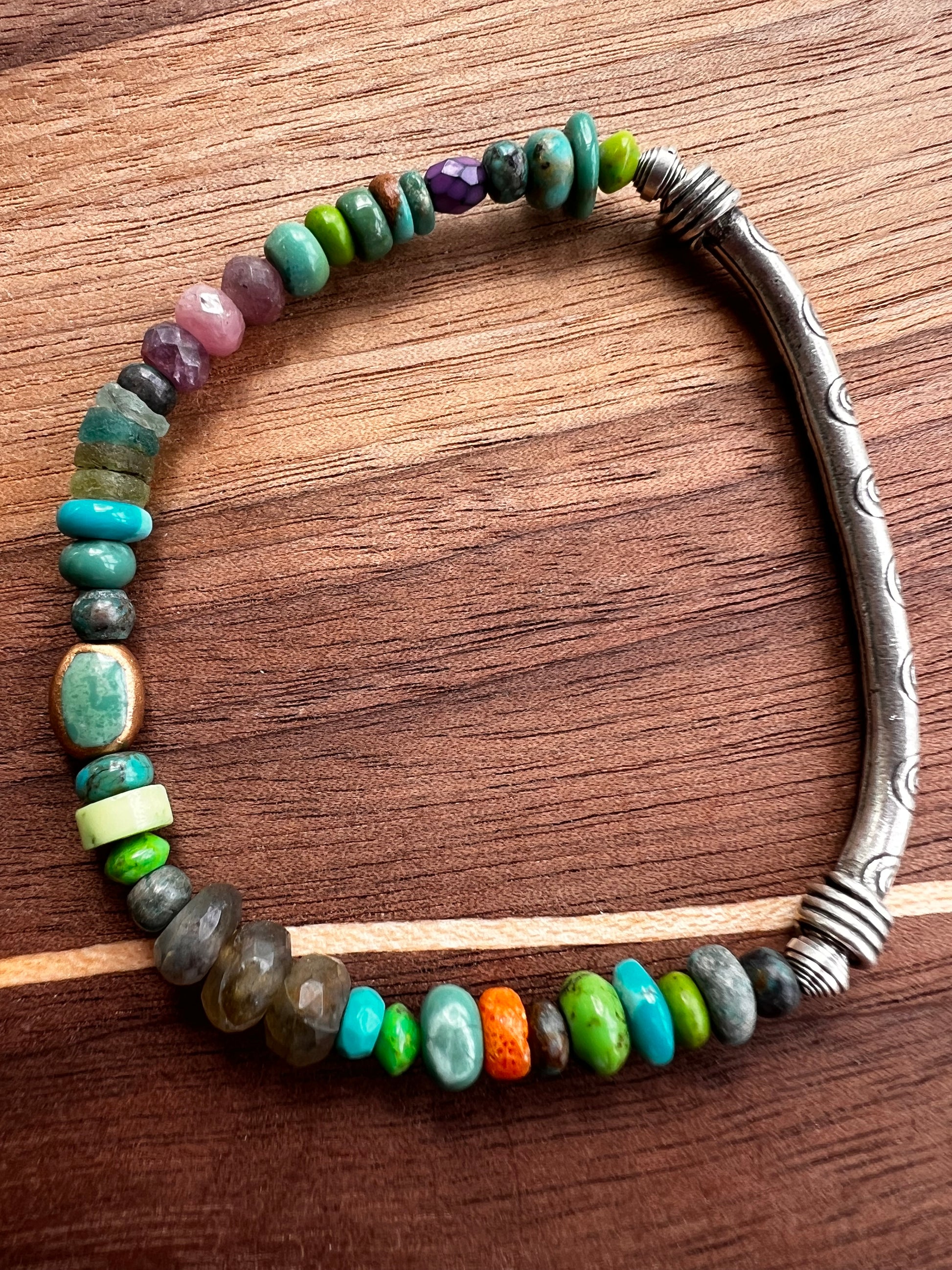 Green and blue turquoise, labradorite, rubies, apple coral, roman glass, Hill Tribe silver