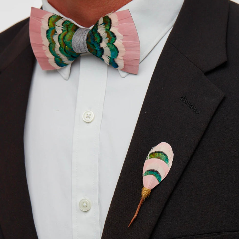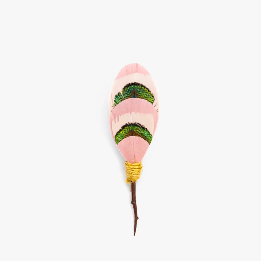 Elevate your style with our Chiricahua Pin. This pink, green, and white lapel pin boasts a layered design in soft shades of pink and cream, featuring goose feathers with pops of green peacock, adding a touch of sophistication to any ensemble.