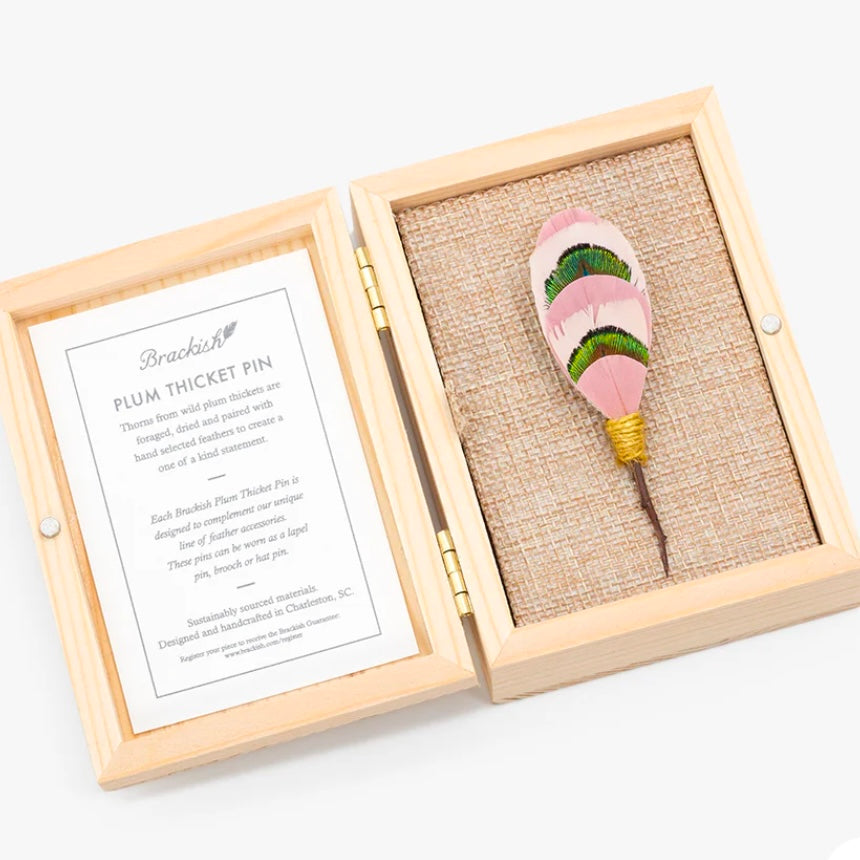 - Feathers for each Plum Thicket Pin are hand-selected, giving each pin a unique coloring.