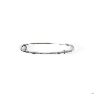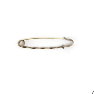 All-purpose handmade safety pin. Perfect as a collar ornament, lapel pin, hat pin, closure, zipper pull — you name it! Choose from solid brass or solid .925 sterling silver - available in a work patina or high-polish finish. Model is wearing Brass / Work Patina.