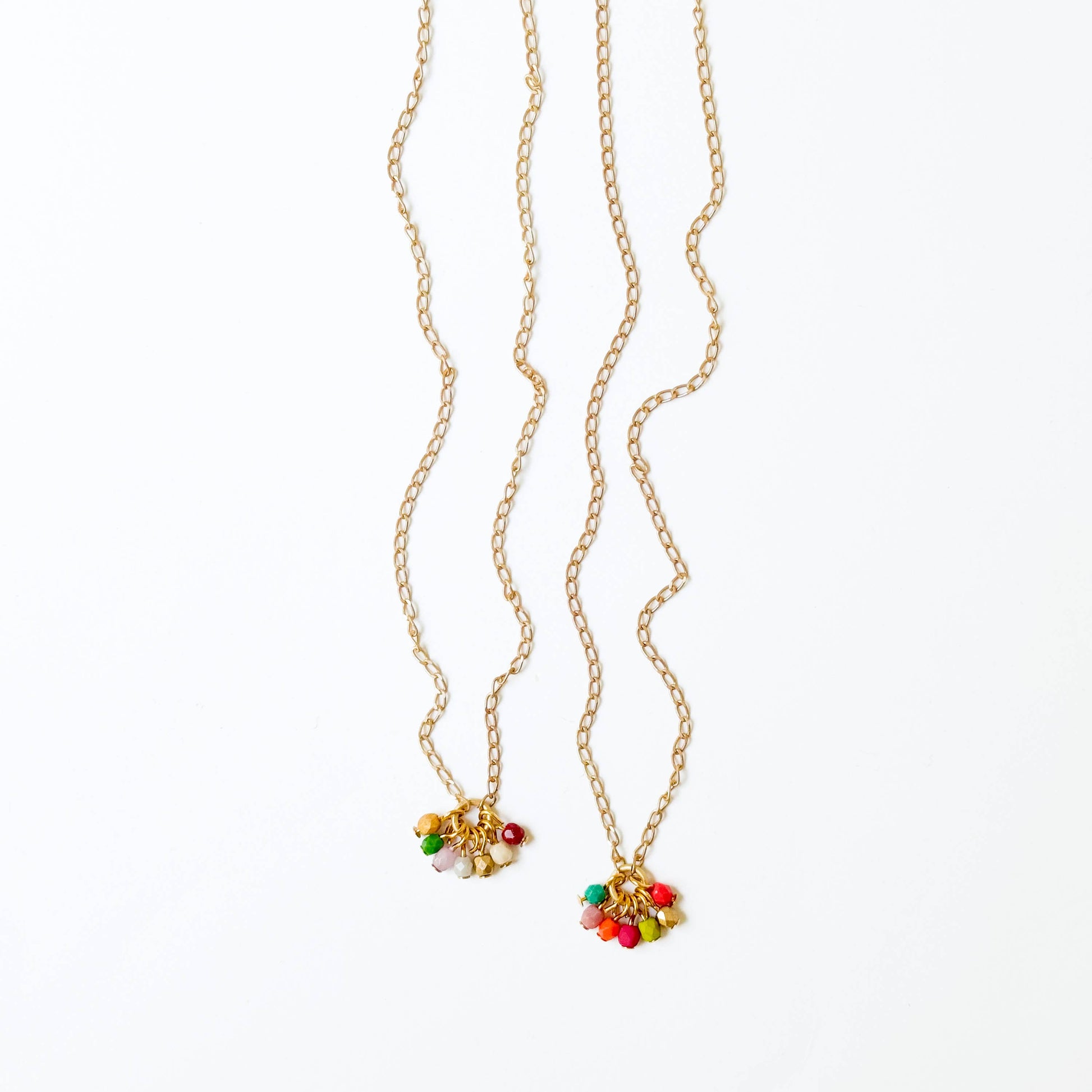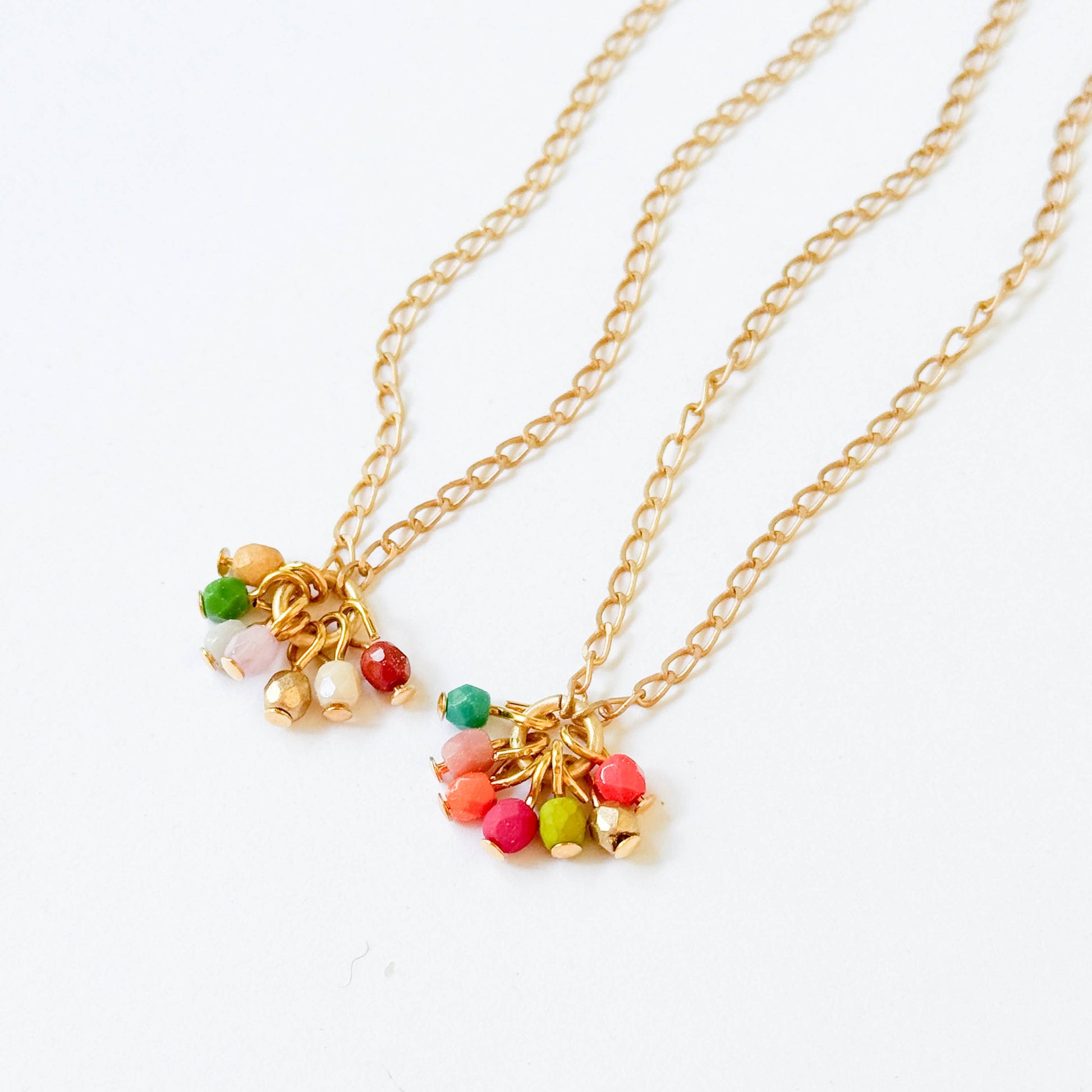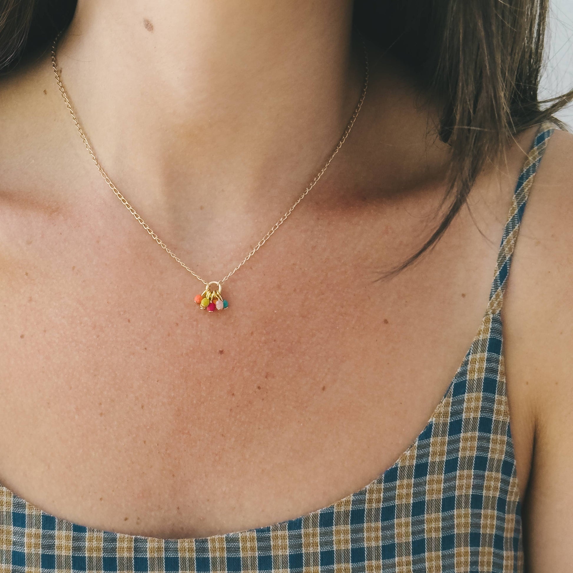 So cute! A dainty 24K gold-plated chain with a tiny cluster of beads. The little cluster is made with seven tiny 3mm beads in two color options: Cluster no.1 (Magenta/ Gold/ Orange/ Green/ Coral/ Lime) Cluster no.2 (Gold/ Rust/ Green/ Cream/ Caramel/ Lilac/Grey) The details: Dainty 24K GP chain Lobster clasp Tiny 3mm beads Handmade in our Burlington VT studio.