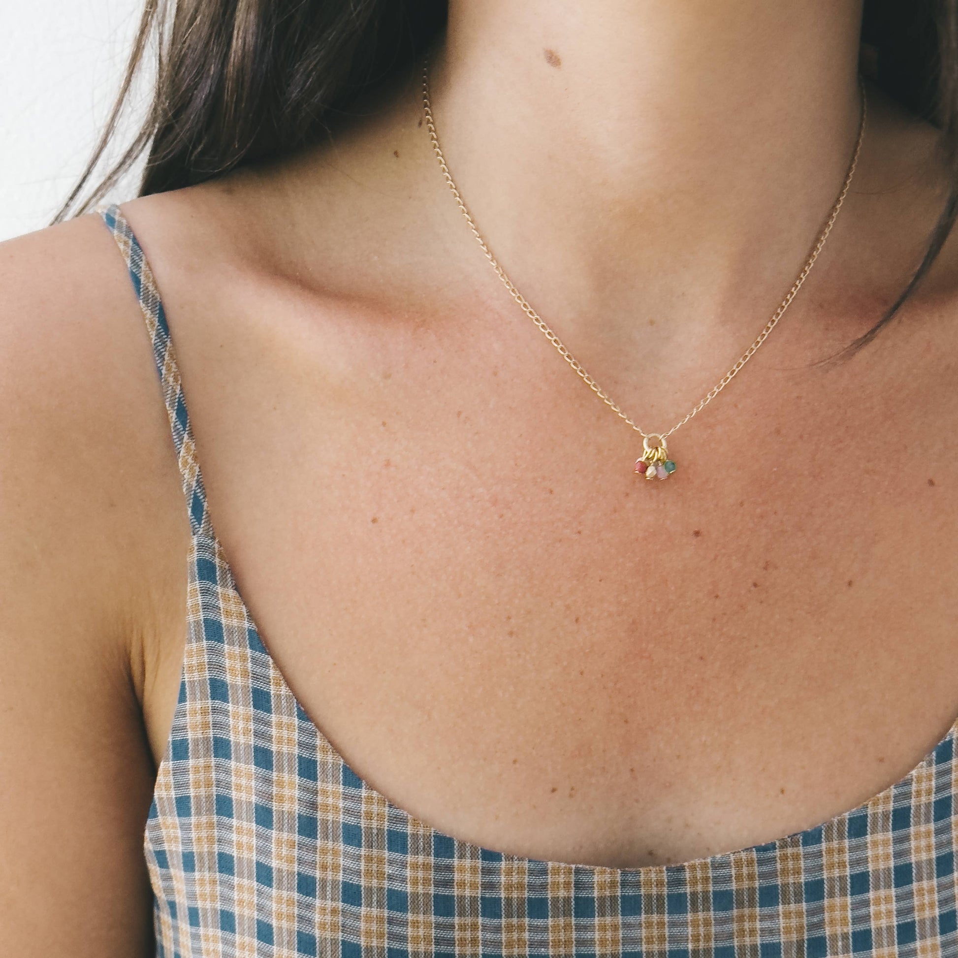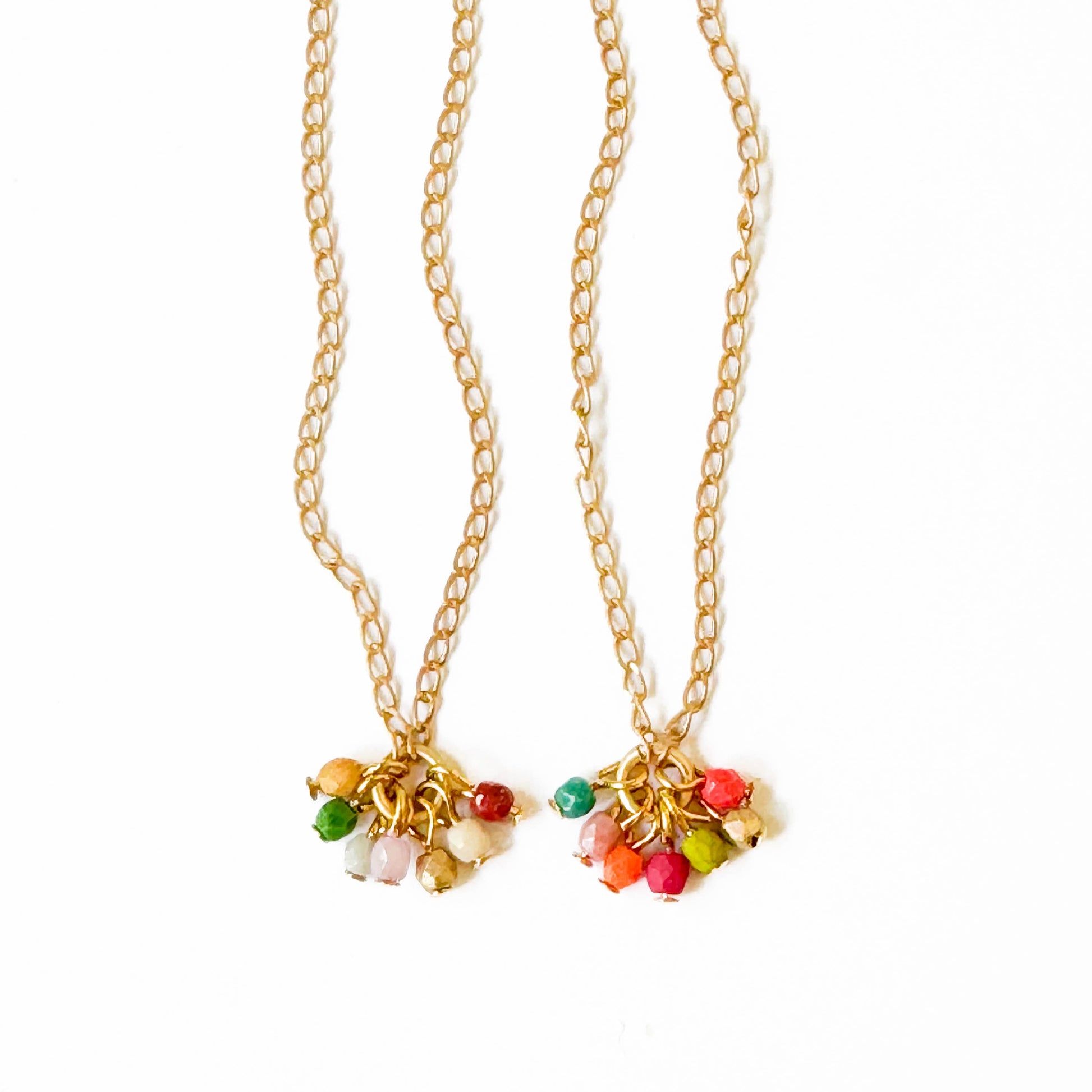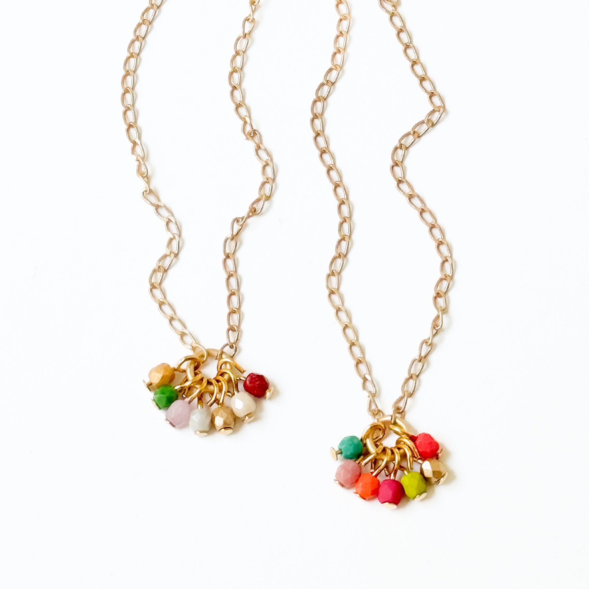 So cute! A dainty 24K gold-plated chain with a tiny cluster of beads. The little cluster is made with seven tiny 3mm beads in two color options: Cluster no.1 (Magenta/ Gold/ Orange/ Green/ Coral/ Lime) Cluster no.2 (Gold/ Rust/ Green/ Cream/ Caramel/ Lilac/Grey) The details: Dainty 24K GP chain Lobster clasp Tiny 3mm beads Handmade in our Burlington VT studio.