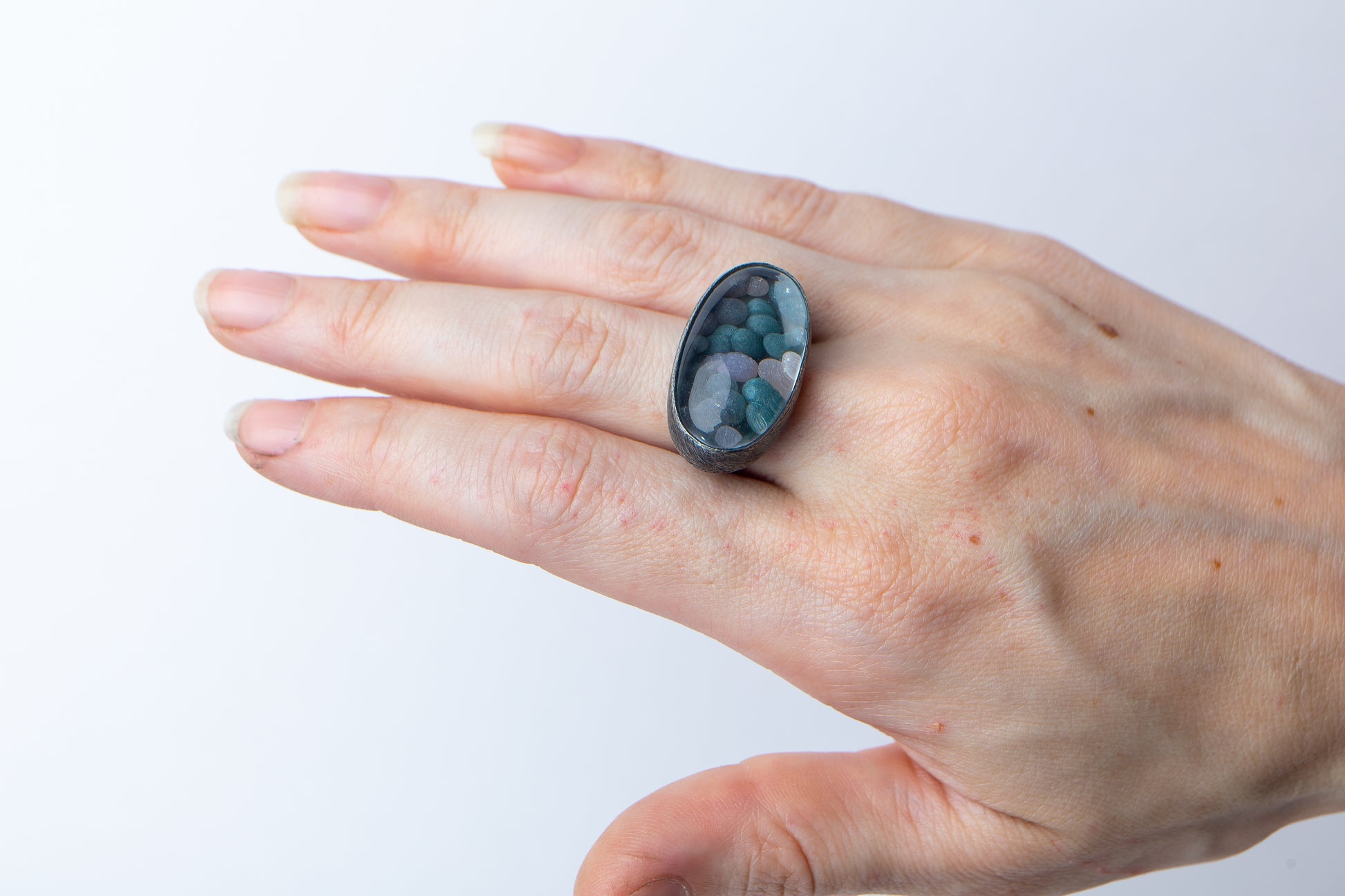 Quartz lens stone magnifying the grape agate crystal clusters underneath, set in silver.
