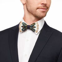 The Amur bow tie is crafted with taupe goose, navy blue pheasant, caramel brown quail, and iridescent copper turkey feathers. Center wrap is navy blue grosgrain.