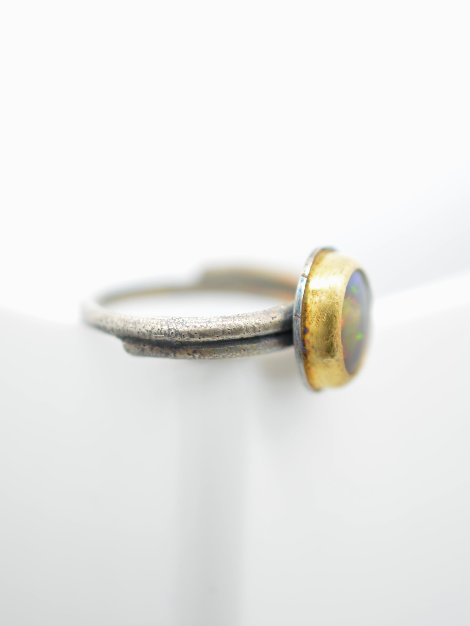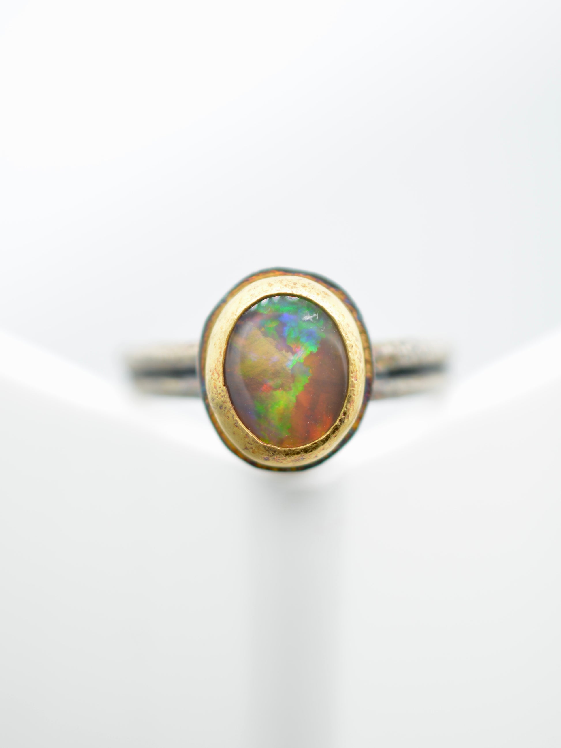 The flash within this beautiful Australian opal is reminiscent of the colours and magic of Aurora Borealis. I love the subtle natural colours of this stone that reveals an incredible rainbow of colour when the light dances over it. One of a kind, this ring features a hand-forged sterling silver Vine style ring shank and a glowing 22k yellow gold bezel.