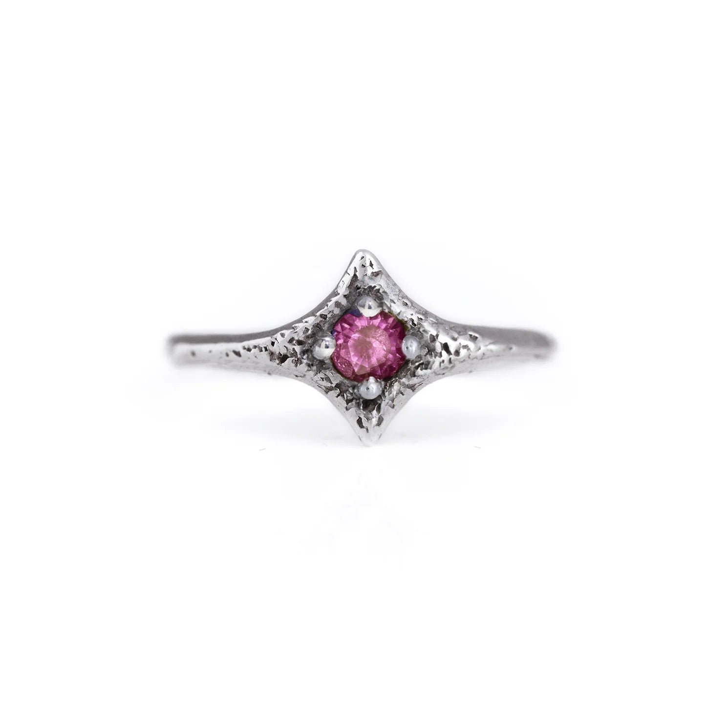 A dainty, mischievous ring created using the cast in place method. Lily Streeter sets each stone is set directly into the wax and hand textures each piece before casting.