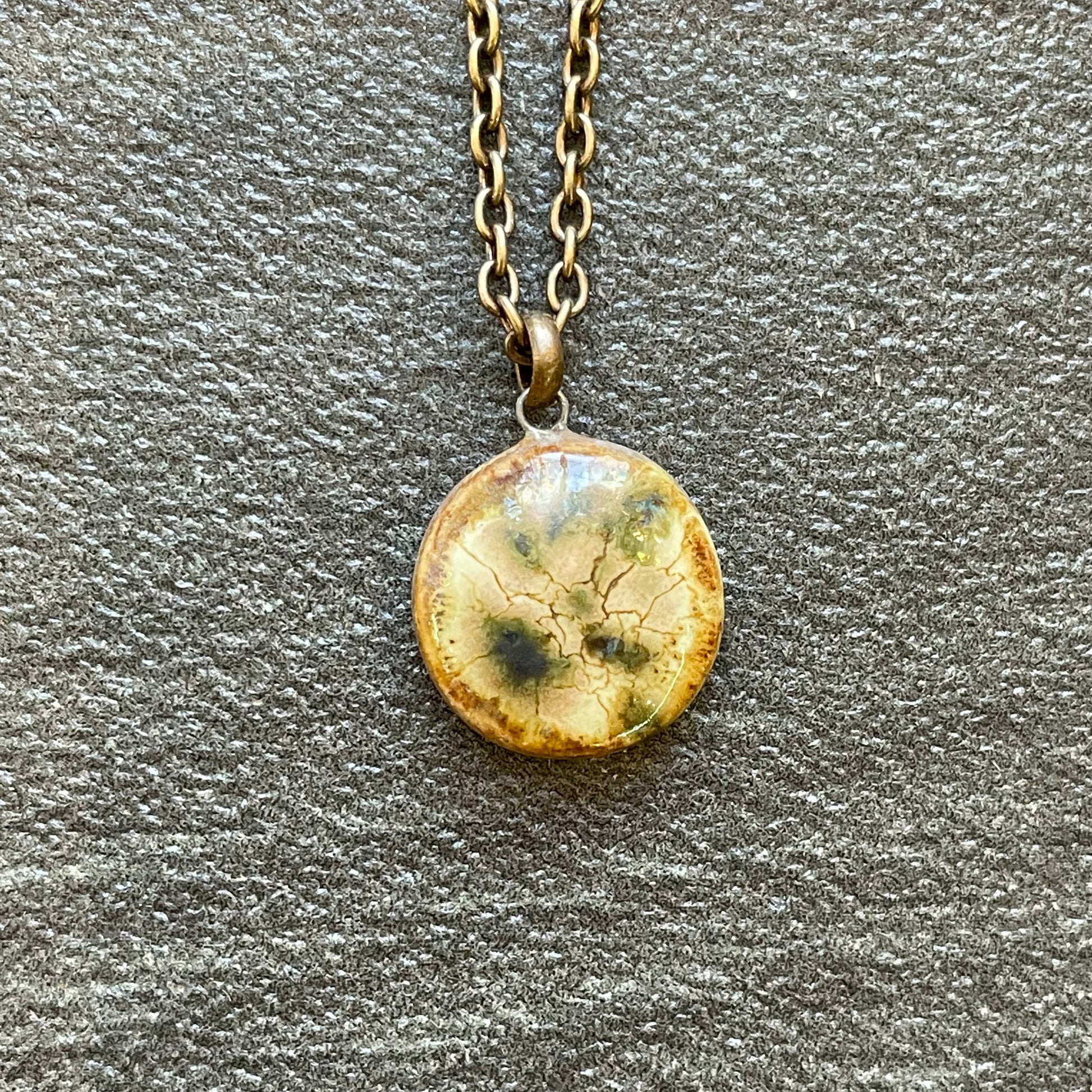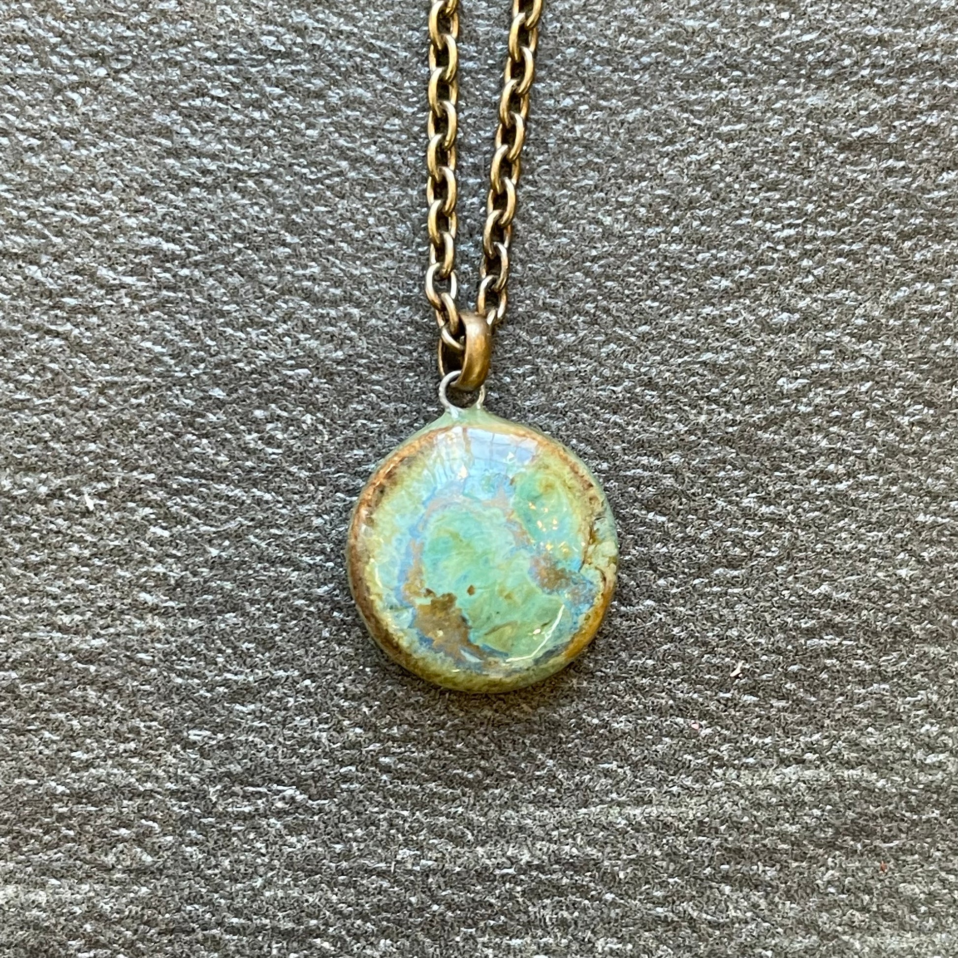 Sweet and simple small circle necklace. Gem measures 7//8” round, with antiqued brass chain at 14” + 3” extender. Available in assorted hand crafted signature glazes.