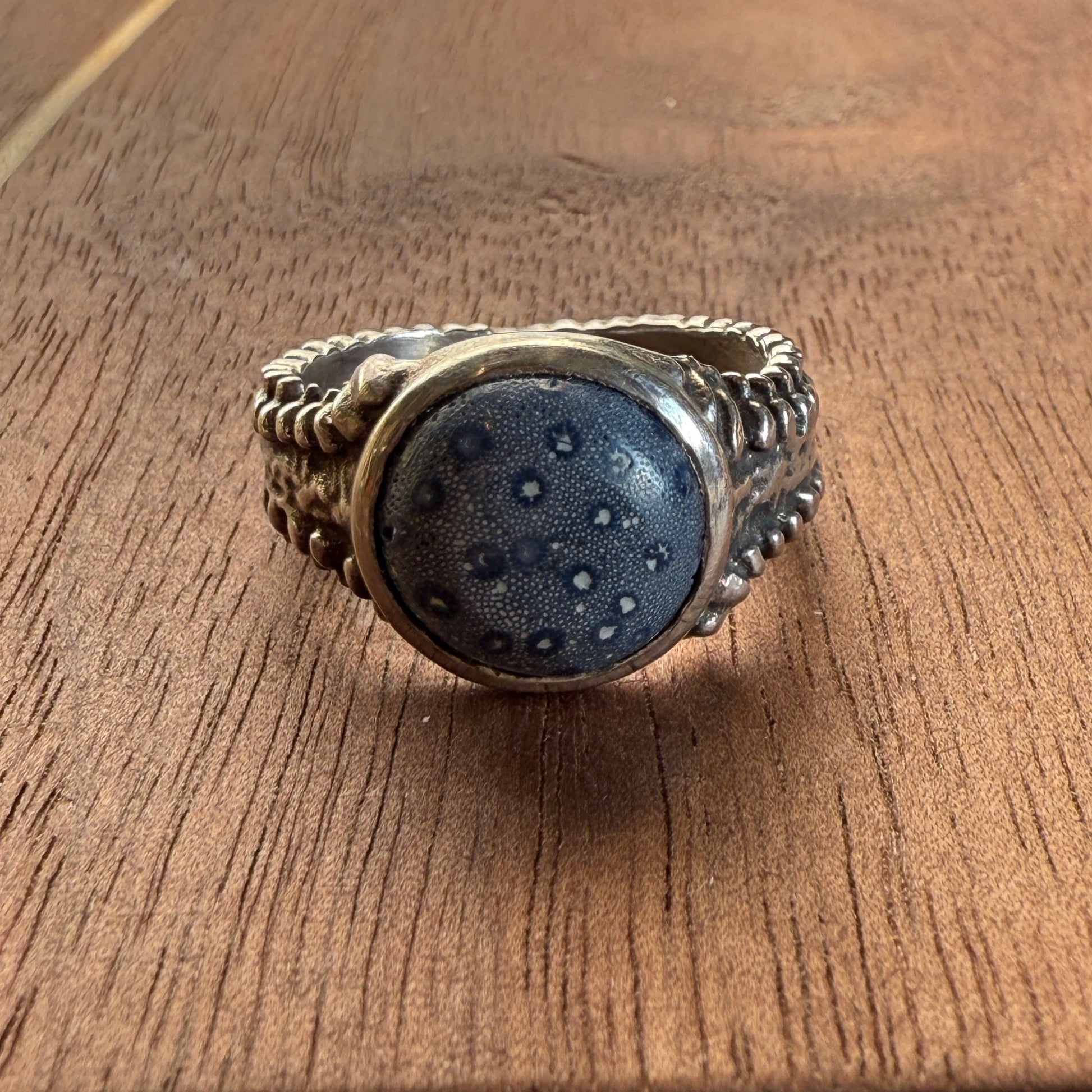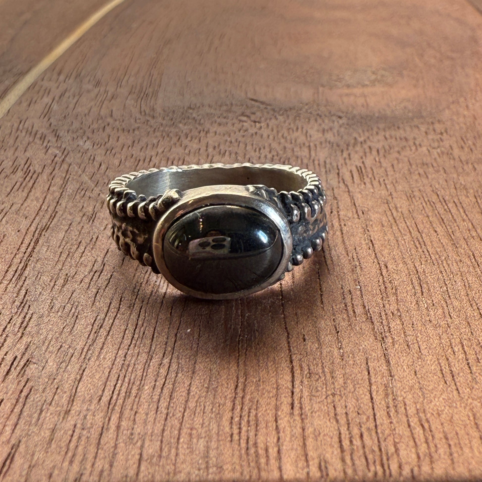 Real starfish arms have been cast into oxidized Sterling Silver and hold a shining oval hematite cabochon tightly in their center. Ready to ship in size 6 1/2